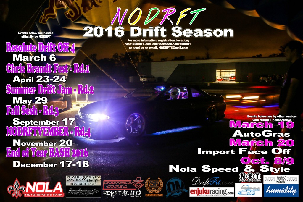 NEW ORLEANS, LA – Drifting is fun. A lot of fun. Just ask any car buff. Now there’s even more reason to dare a little and take the thrill to new heights. NOLA Motorsports Park is excited to announce the 2016 NODRFT schedule.